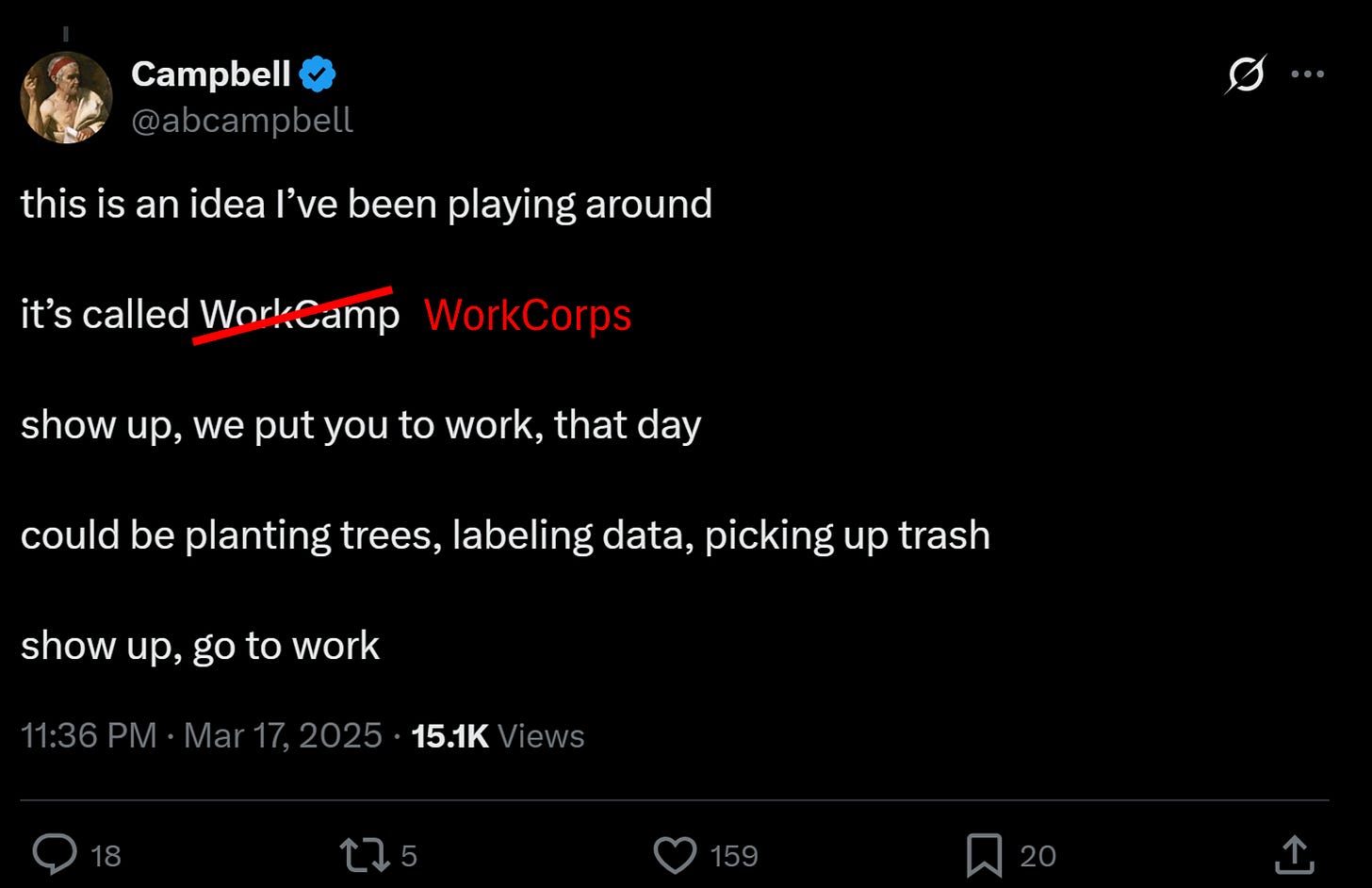 I even pitched what we're calling WorkCamp WorkCorps: show up, we put you to work that day. Could be planting trees, labeling data, picking up trash. But that's another ramble.