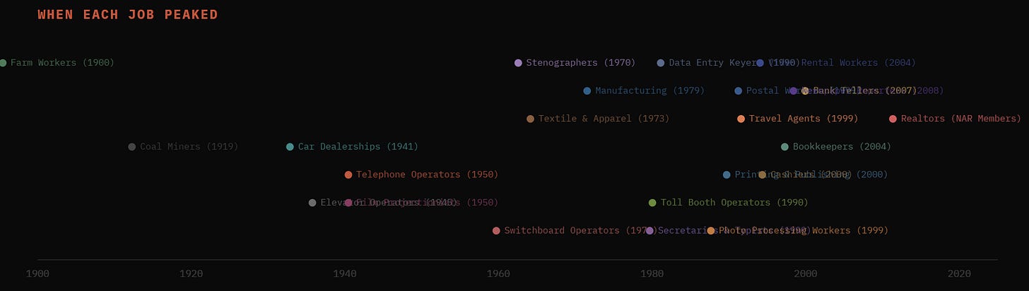 Sort by peak year and you see the wave structure: agricultural jobs peak pre-1920, industrial jobs 1940s-1979, clerical 1970s-1990s, internet-era 1999-2008. Farm to factory to office to screen. The same pattern we saw in our piece on farmers and lamplighters, a lot of the jobs that no longer exist involved humans creating, organizing, and manipulating information. Which also happens to describe a lot of the ‘service economy’ jobs that are about to go away. Each time, we find a more efficient way to operate.