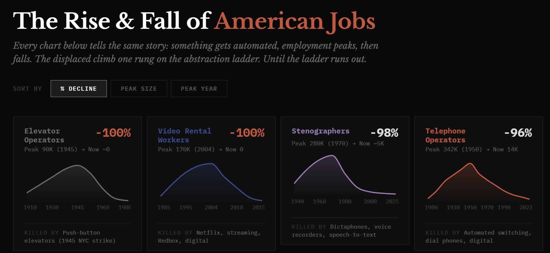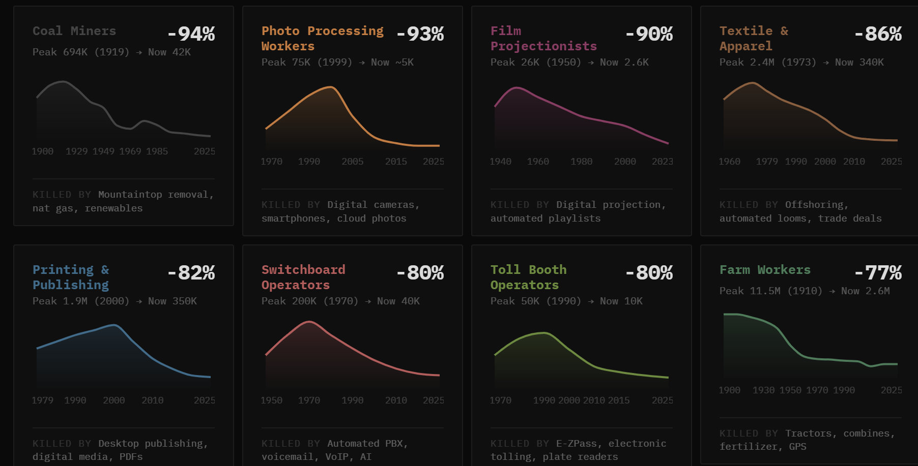 And that’s the pattern. Stenographers: -98%. Telephone operators: -96%. Coal miners: -94%. Photo processing (my people): -93%. Film projectionists: -90%. Technology arrives, employment peaks, then falls. The displaced climb one rung up the abstraction ladder. Then, a generation later, that rung gets automated too.
