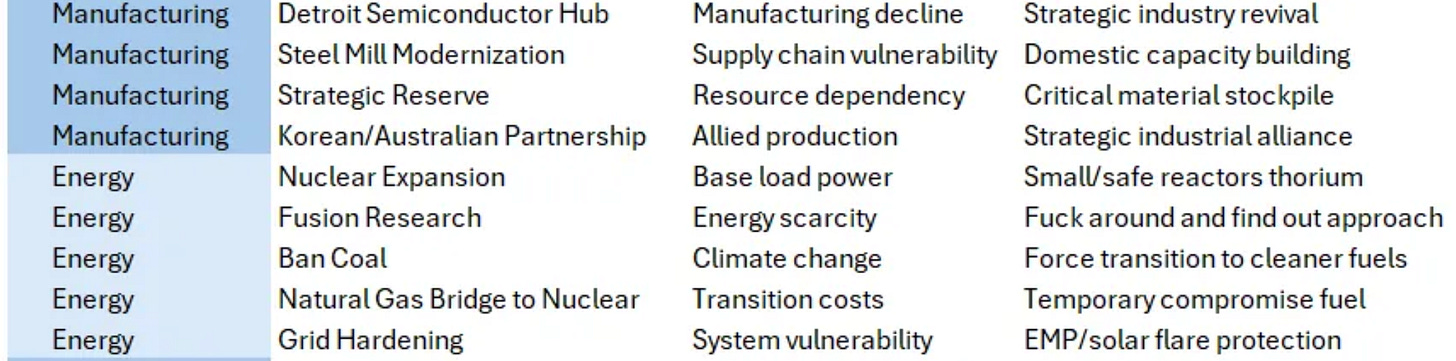 Critical minerals. Lithium, cobalt, rare earths, copper, uranium. US has $6.2T in identified reserves. CHIPS Act, IRA, and defense needs are rebuilding domestic extraction. We wrote about China’s chokehold on gallium last year; this is the supply-side response. The 21st century version of the oil boom.