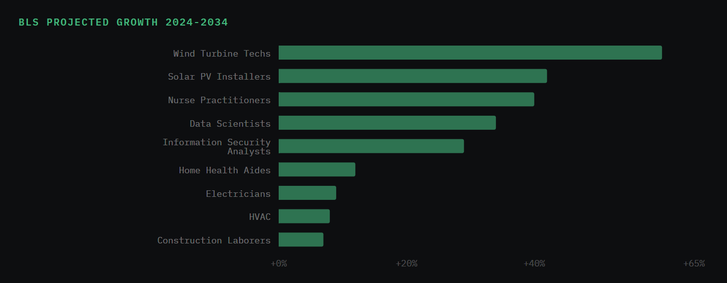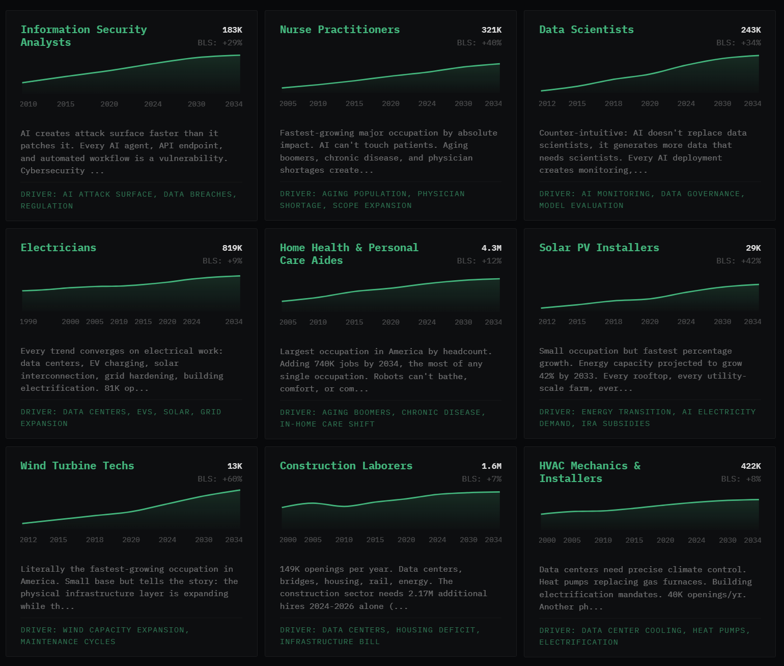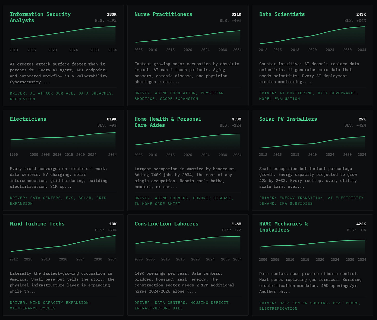 Electricity. Every AI inference burns watts. Data center demand projected to triple to 80GW by 2030. Electricians: +9%, 81K openings per year. Solar installers: +42%. Wind turbine techs: +60%, literally the fastest-growing job in America. Small base, big signal: the physical infrastructure layer is expanding while the information layer automates.