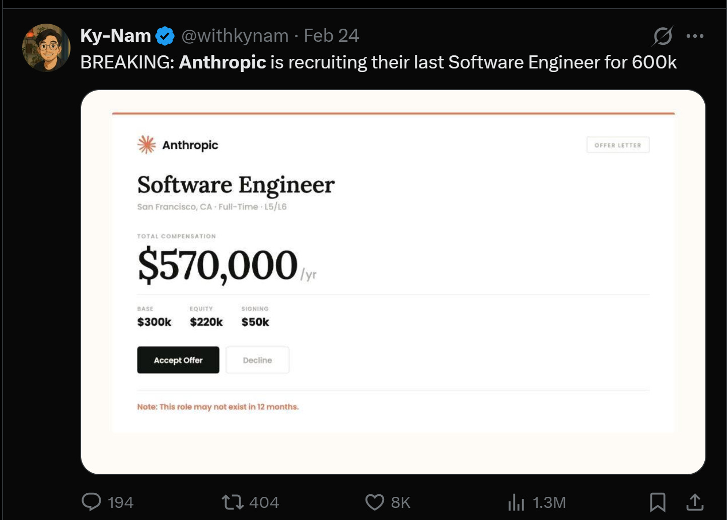 That said, I’m not sure this one is a straight short. Software might be the best candidate for Jevons paradox in the whole list. If AI makes code 10x cheaper to produce, does the world want 10x less code or 100x more? Every company that couldn’t afford a dev team can now ship product. Every internal tool that never got built because IT was backlogged for six months gets built in an afternoon. The demand for what software does is basically infinite. What changes is who writes it and how much they get paid. $570K L5s probably fine. The army of juniors grinding out CRUD apps, less so.