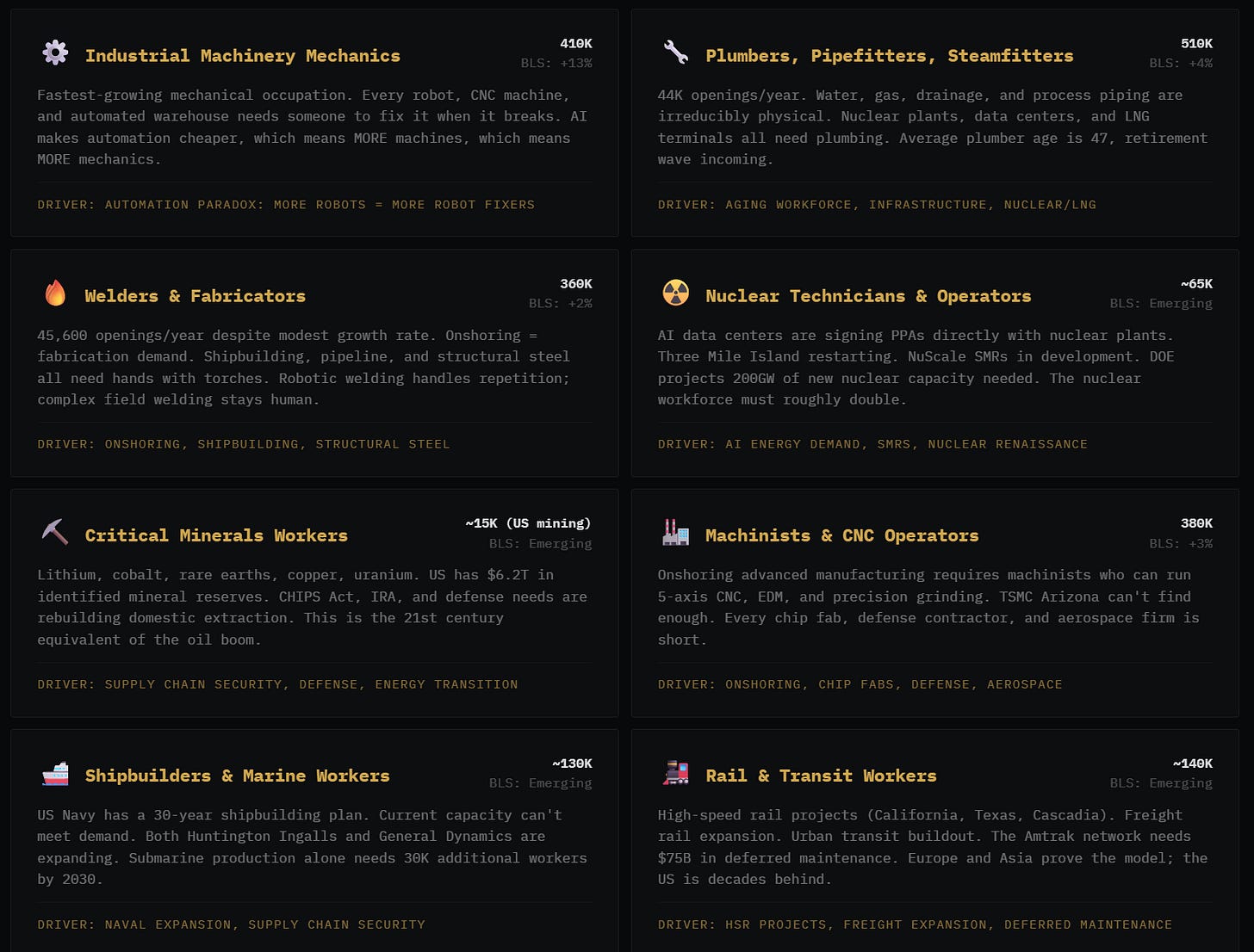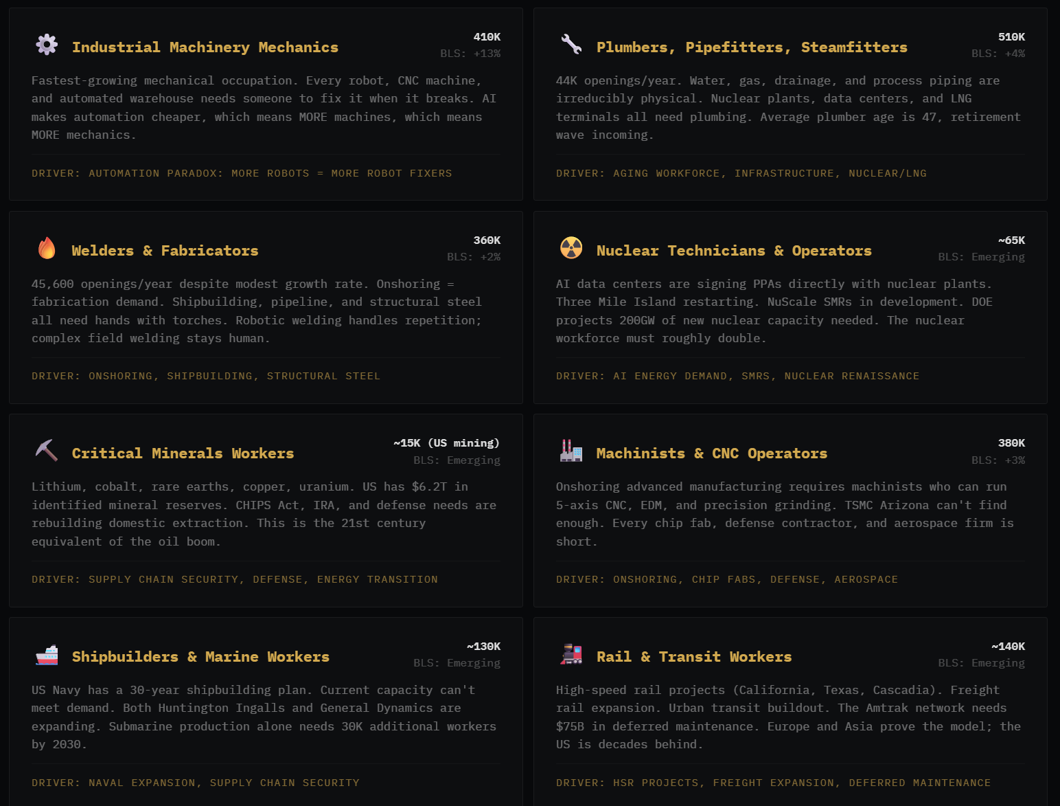 The common thread: can’t offshore, can’t automate (yet), existing workforce aging out, and they carry a wage premium. The skilled trades gap is 650K unfilled openings per year.
