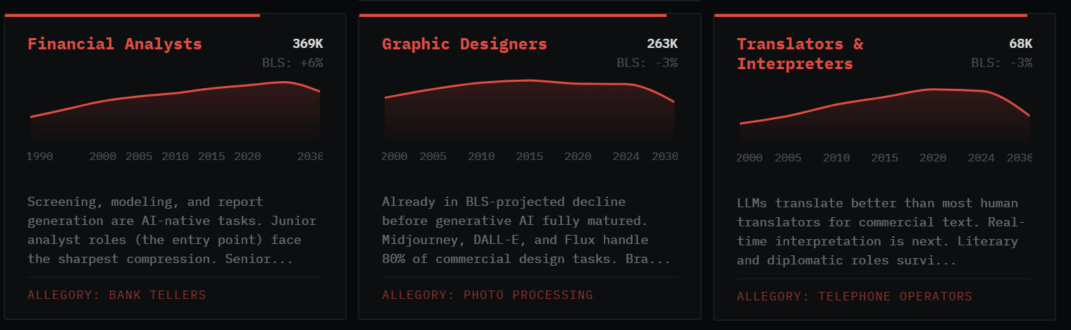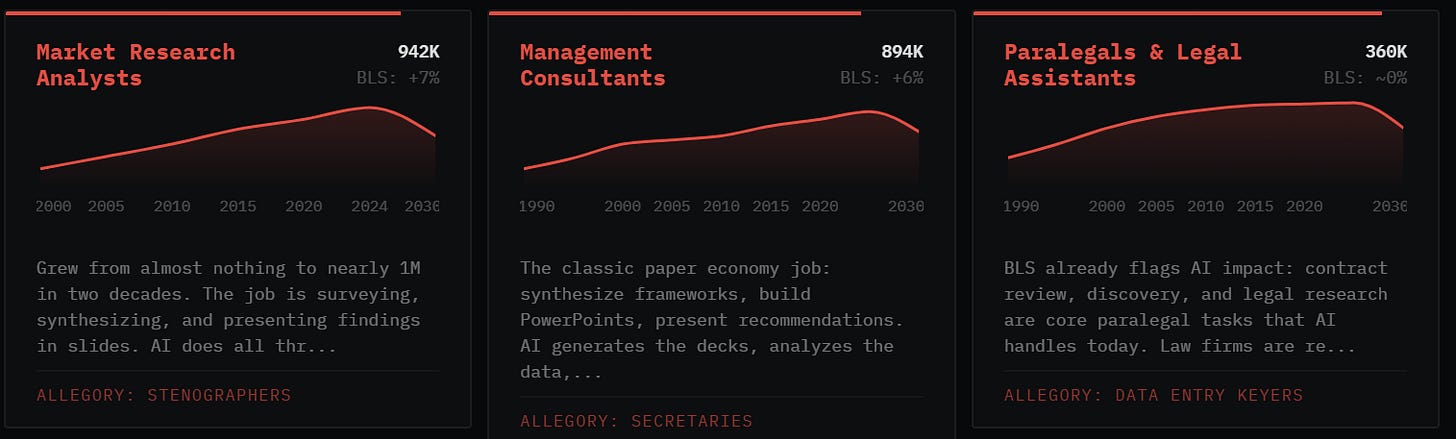 Market Research Analysts (942K) — Grew from almost nothing to nearly 1M in two decades. The job is surveying, synthesizing, and presenting findings in slides. All three steps are now an LLM prompt. Allegory: stenographers.